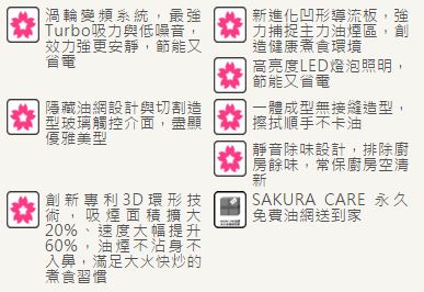 創新專利3D環吸技術,油煙不沾身不入鼻中式功能、歐化造型,排煙吸力強勁,滿足大火快炒的煮食習慣切割造型玻璃搭配電容式觸控介面,盡顯簡約質感5段風速選擇,輕鬆搭配您的煮食習慣,有效節能靜音除味設計,排除廚房餘味,常保廚房空氣清新LED節能燈泡,壽命更長又省電SAKURA CARE 永久免費油網送到家