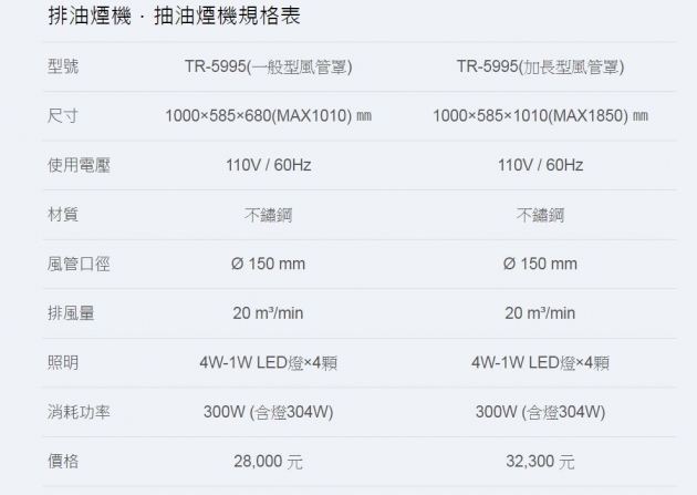【永勝廚具】莊頭北TR-5995中島型排油煙機 (一般型風管罩)加長型風罩,價格另議