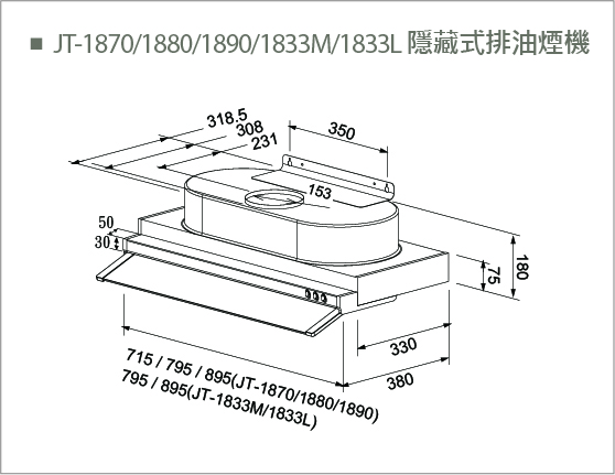【永勝廚具】喜特麗JT-1833(80cm/90cm)整台不鏽鋼隱藏式油煙機(二級馬達,超強排煙) |