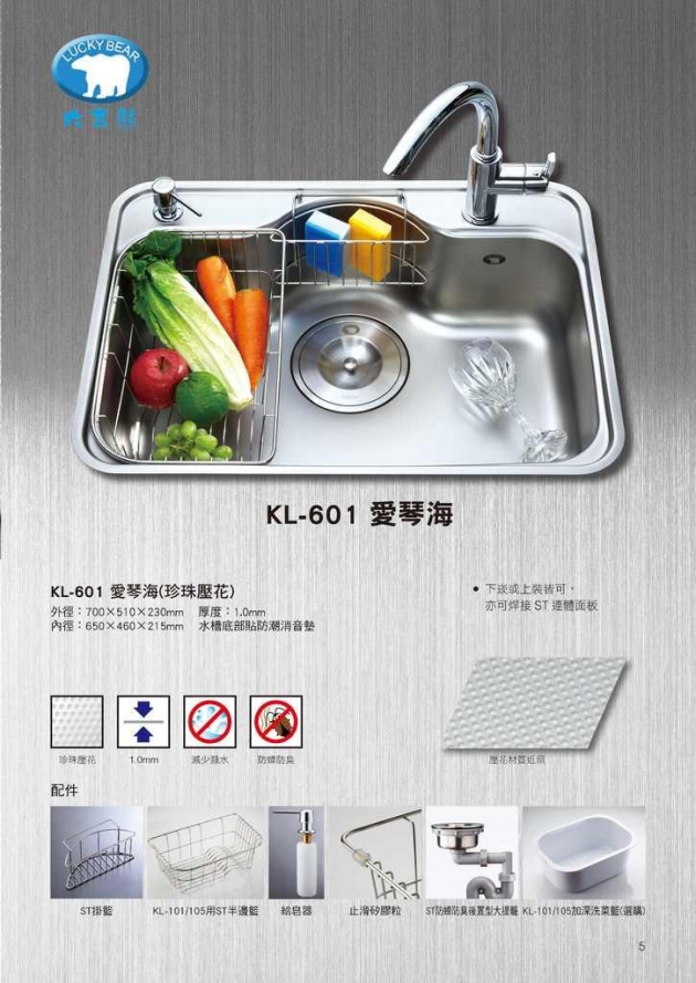 【永勝廚具】KL601高質感進口珍珠壓花水槽1.0mm(價格不含水龍頭)內徑65x42x21.5