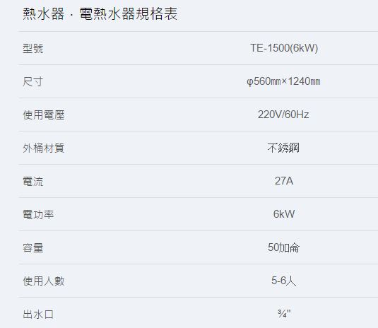 【永勝廚具】莊頭北TE-1500(50加侖)儲熱式電熱水器(直立式)送基本安裝