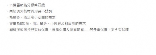 ‧ 為立式,容量為8加侖,滿足小套房使用需求