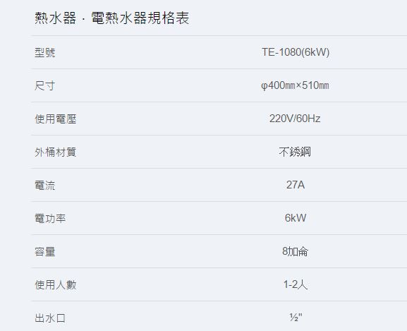 【永勝廚具】莊頭北-TE1080(8加崙)儲熱式電熱水器(直掛)