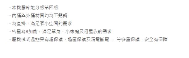 ‧ 為立式,容量為8加侖,滿足小套房使用需求