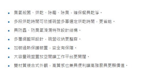 臭氧殺菌、烘乾、除霉、除臭,確保餐具乾淨。