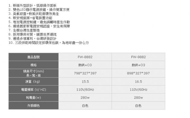 【永勝廚具】豪山FW--8882(白)/FW-9882(白)臭氧殺菌烘碗機