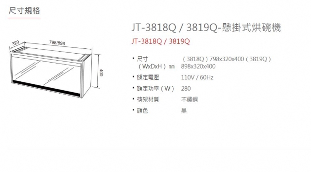【永勝廚具】喜特麗JT-3818Q/JT-3819Q黑色鏡面懸掛式烘碗機(新品特價送安裝)