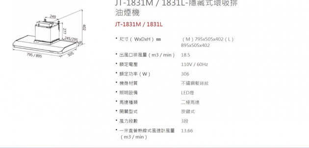 【永勝廚具】喜特麗JT-1831M/L隱藏式環吸排油煙機