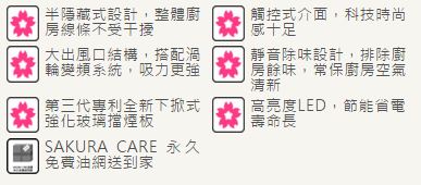 半隱藏式設計,整體廚房線條不受干擾觸控式介面,科技時尚感十足大出風口結構,搭配渦輪變頻系統,吸力更強靜音除味設計,排除廚房餘味,常保廚房空氣清新第三代專利全新下掀式強化玻璃擋煙板高亮度LED,節能省電壽命長SAKURA CARE 永久免費油網送到家