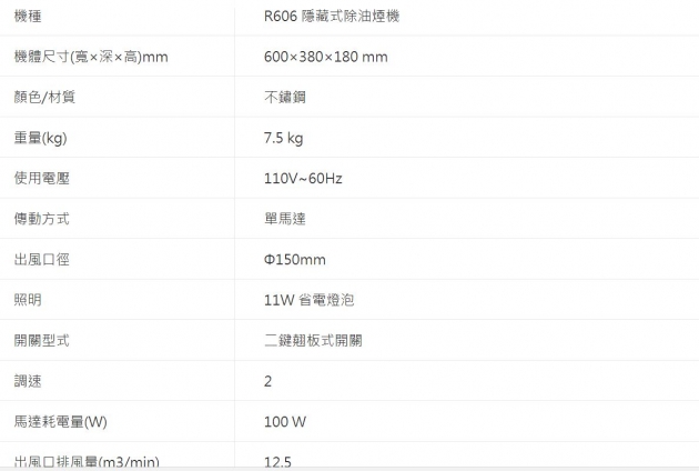 櫻花排R-606歐式小套房專用單馬達隱藏式油煙機(整台不鏽鋼)