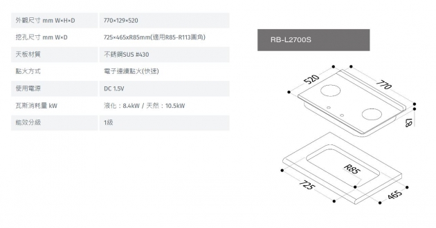 林內RB-L2700S檯面式彩焱不銹鋼雙口爐/大口面板,1級節能