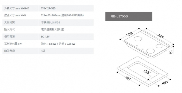 林內RB-L3700S檯面式彩焱不銹鋼三口爐/可選N左大或R右大,1級節能