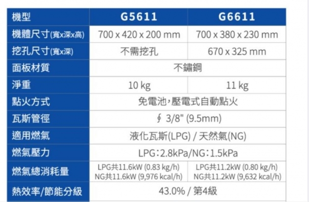 櫻花 G6611 三環銅爐頭崁入式安全爐/能源效率3級