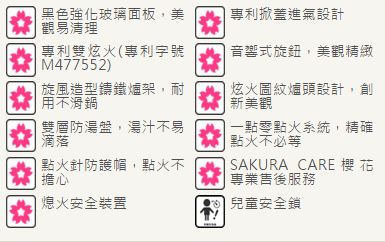 黑色強化玻璃面板,美觀易清理專利掀蓋進氣設計專利雙炫火(專利字號M477552)音響式旋鈕,美觀精緻旋風造型鑄鐵爐架,耐用不滑鍋炫火圖紋爐頭設計,創新美觀雙層防湯盤,湯汁不易滴落一點零點火系統,精確點火不必等點火針防護帽,點火不擔心熄火安全裝置兒童安全鎖SAKURA CARE櫻花專業售後服務黑色強化玻璃面板,美觀易清理