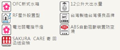 OFC新式水箱12公升大出水量RF屋外設置型台灣製造台灣優良品牌電池弱電指示燈ABS自動阻斷裝置防空燒SAKURA CARE寄回函送安檢