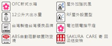 OFC新式水箱屋外加強抗風12公升大出水量RF屋外設置型台灣製造台灣優良品牌電池弱電指示燈ABS自動阻斷裝置防空燒SAKURA CARE寄回函送安檢