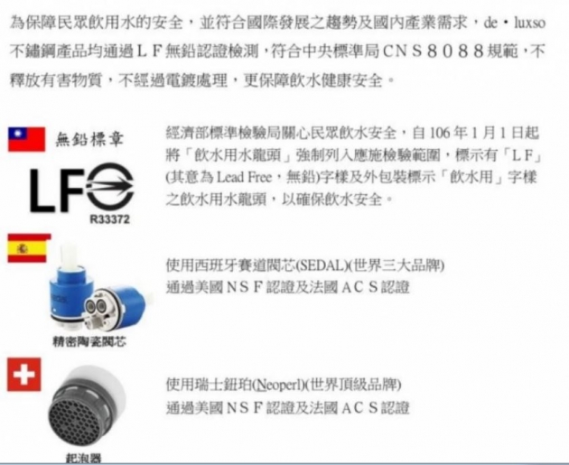 de•luxso不鏽鋼產品均通過LF無鉛認證檢測,符合中央標準局CNS8088規範,不釋放有害物質,不經過電鍍處理,更保障飲水健康安全