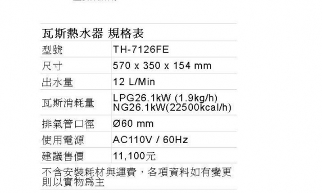 【永勝廚具】莊頭北TH-7126強制排氣12L數位恆溫,公寓專用機型(送基本安裝) |