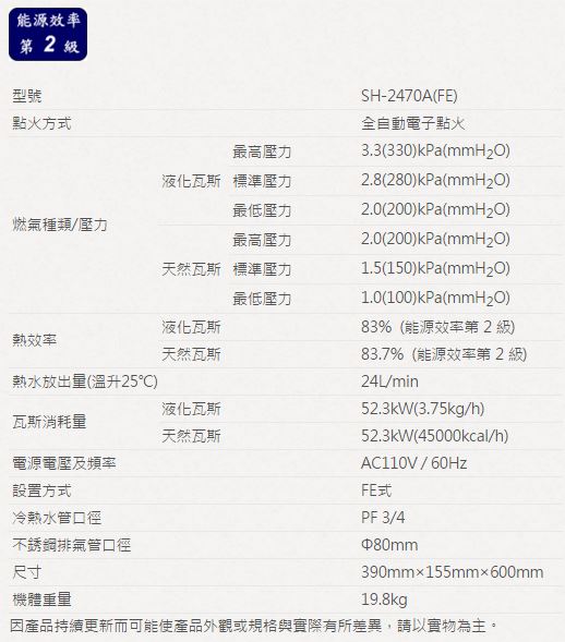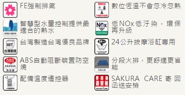 FE強制排氣數位恆溫不會忽冷忽熱智慧型水量控制提供最適合的熱水低NOx低汙染,環保再升級台灣製造台灣優良品牌24公升按摩浴缸專用ABS自動阻斷裝置防空燒分段火排,更舒適更省能配備溫度遙控器SAKURA CARE寄回函送安檢