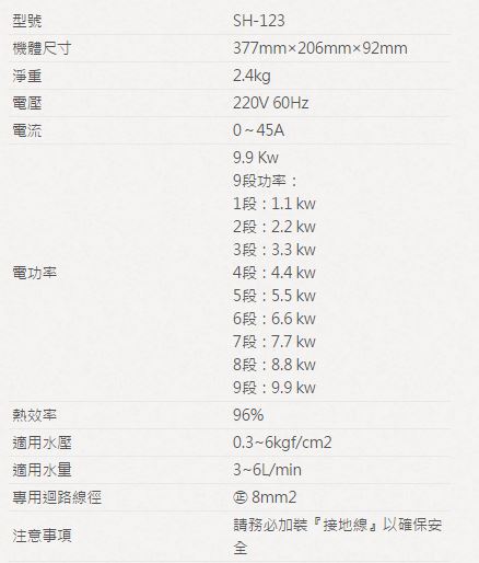 【永勝廚具】櫻花 SH-123 瞬熱式九段調溫電熱水器(220V)送基本安裝