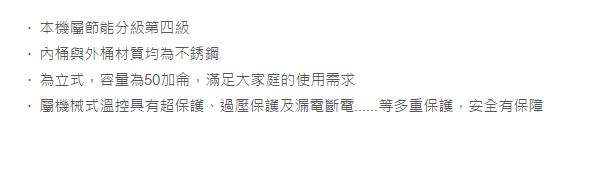 ‧ 為立式,容量為50加侖,滿足大家庭的使用需求和營業用