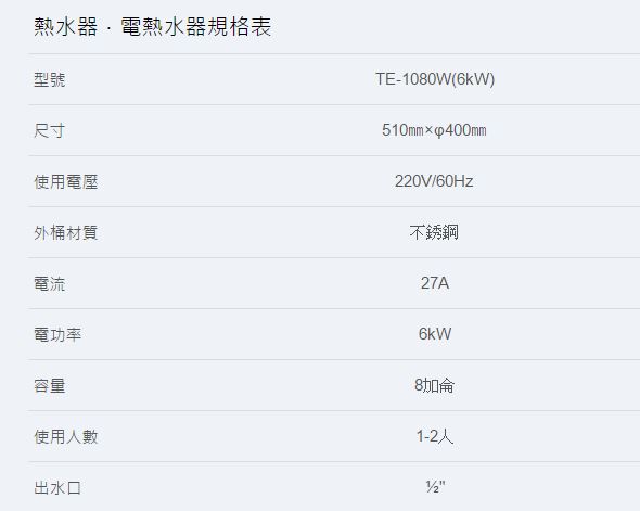 【永勝廚具】莊頭北TE-1080W(8加崙)儲熱式電熱水器(橫掛)送基本安裝