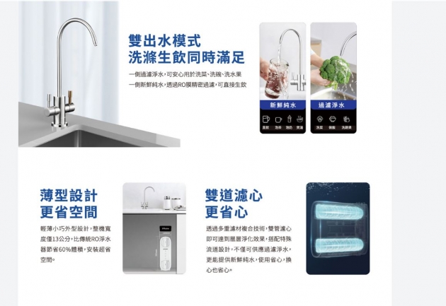 雙出水模式,可依需求選擇純水生飲或過濾水洗滌